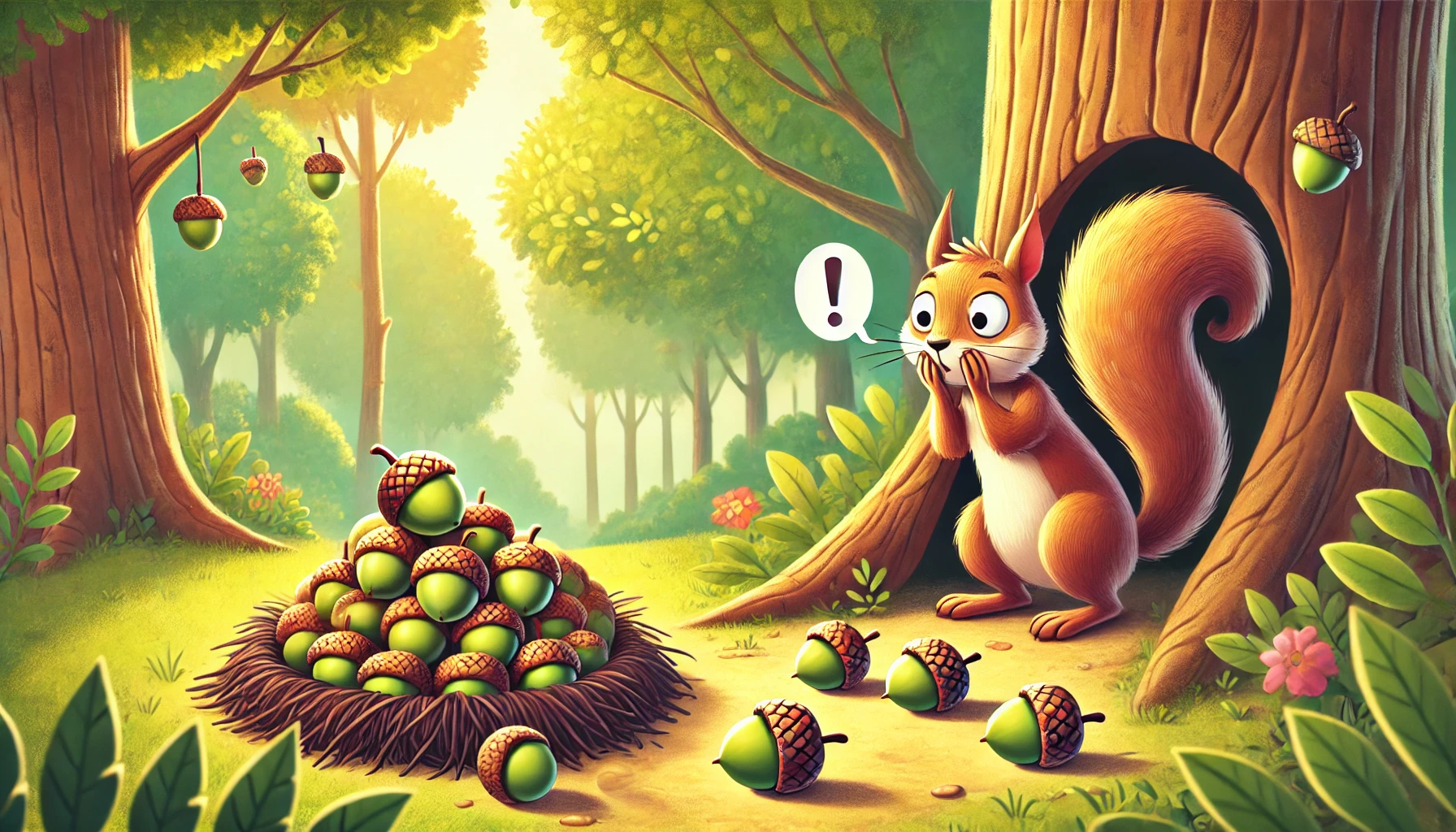 다람쥐는 도토리를 심어서 나무로 키우기로 했어요. 이렇게 하면 더 많은 도토리를 얻을 수 있죠!