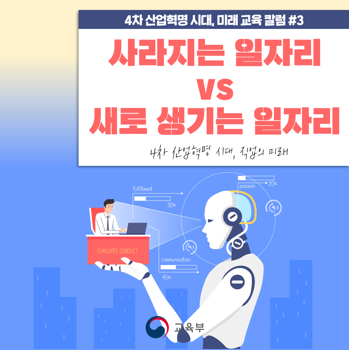 - 미래의 일자리에서는 지금까지 경험하지 못한 새로운 도전이 많을 것입니다. 이에 대한 두려움보다는 새로운 도전에 적극적으로 도전하고 실패와 성공을 경험해 나가는 것이 중요합니다.